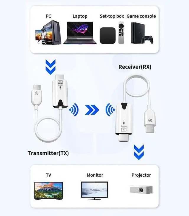 ^^ 1080P HD TransmissionOur hdmi wireless can support 1080P@60Hz resolution, allowing you to enjoy the feeling of home theater and experience the delicate screen images, allowing you and your family to stream media, play movies, and play games. You can feel the clarity and detail in every game. ^^ Wide CompatibilityThis wireless hdmi transmitter is compatible with most HDMI output devices, including laptops, camcorders, Blu-ray players, cameras, set-top boxes and other devices. It is a must-have product for home entertainment, conference rooms, and multimedia education.