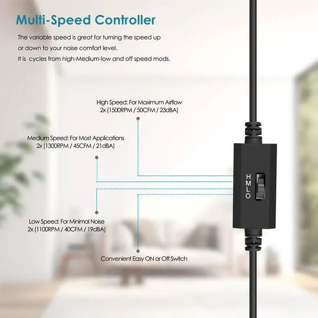 It is cycles from high-Medium-low and off speed mods. You can put it at whatever setting you want, and when your devices is turned on, it automatically turn on, and when it is turned off, the fan will turn off. ^^ Good DIY Cooling SolutionIt works great for DIY cooling fan or as an additional cooling fan for your gaming needs. Such as router, cabinet, x-box, SSD, Modem, DVR, Receiver, Streaming boxes, Security Camera NVR, android box, stereo, T-Mobile gateway. Good balance of quiet and airflow.