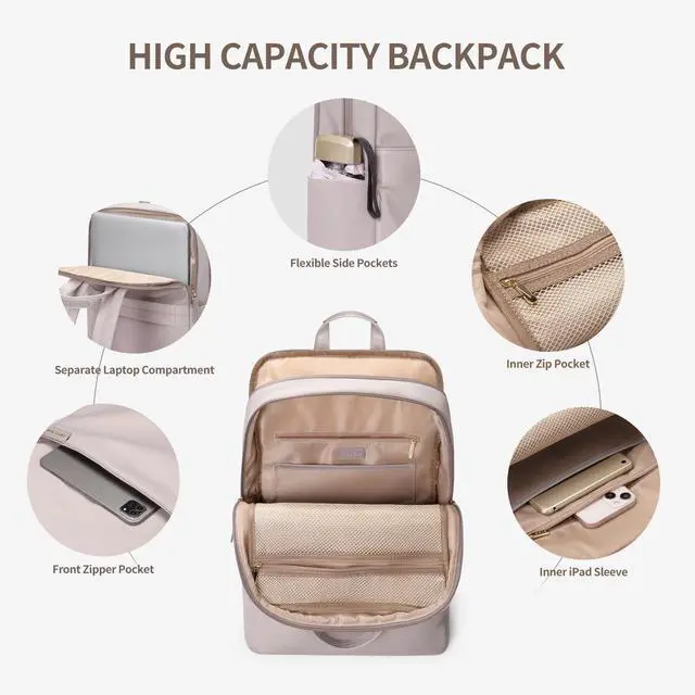 Pockets: The backpack has a main compartment, one inner slip pocket, one mesh zip pocket, an inner zip pocket, one front zipper pocket, a back slip pocket, a back zip pocket, and two side pockets to keep your items organized and easier to find. A separate laptop compartment at the back holds 15.6 Inch, 15 Inch, 14 Inch, and 13 Inch Laptops ^^
