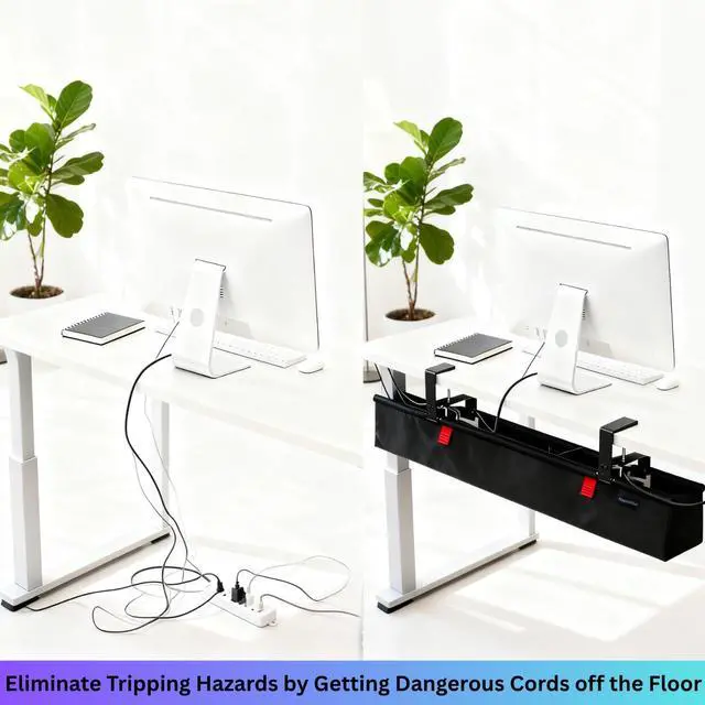 Compatible Thickness: 0.1" to 1.96" (requires a uniform edge) ^^ DURABLE OXFORD FABRIC & STURDY METAL FRAME With heavy-duty, 600D Oxford fabric and a reinforced steel frame, this desk cable organizer is built to last. It supports significant weight without sagging and resists wear, fraying, and damage from pets or vacuum cleaners. Also works for kitchen counters, entertainment centers, and behind TV stands. ^^ PROPER VENTILATION & INSTANT ACCESS Prevent overheating for power strips and adapters with this ventilated tray. This cable management kit eliminates clutter and includes writable Velcro straps for instant cord identification.