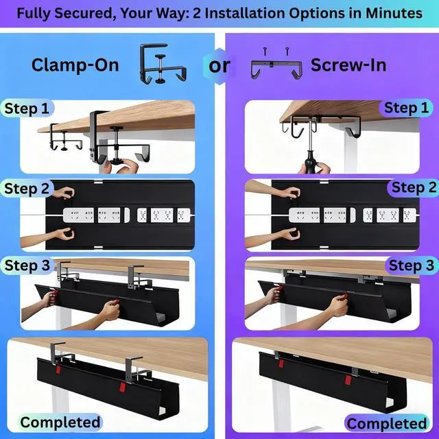 ^^ TWO EASY INSTALLATION OPTIONS FOR ANY DESK Achieve a secure hold with a no-drill clamp or permanent screw-mounts for your desk setup. The clamp on under desk organizer fits standing desk, height-adjustable desk, electric desk, home desk, office desk, gaming desk, mechanical desk & more.