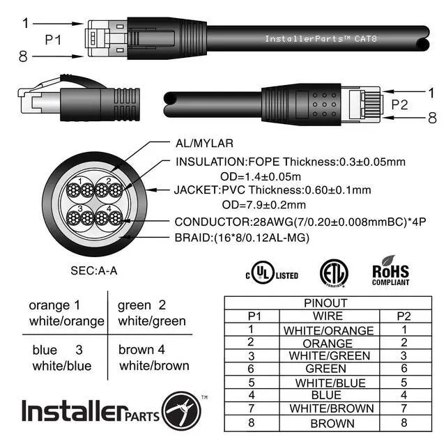 High Speed Cat8 Cable: The Installerparts Cat8 Patch Cable Is Ideal For Use In A Performance Demanding High Speed Ethernet Network Or Where Future-Proofing Is Desired. Our Cat8 Cables Are Fully Backward Compatible With Existing Gigabit Or Cat5, 6 & 7 Networks. ^^ High Quality 100%