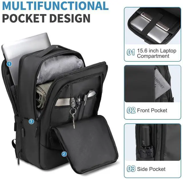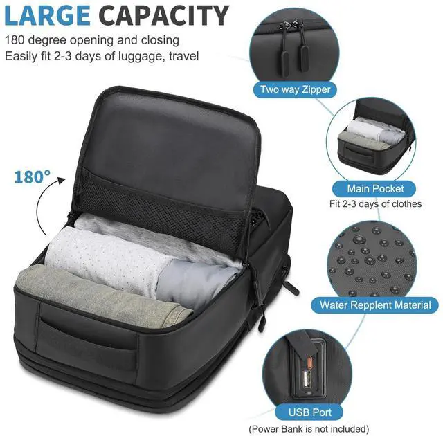 (Note: Power bank and data cable are not included) ^^ -- TSA-Approved & Luggage Strap -- This carry-on backpack features a 180 lay-flat opening that makes packing and organization easy. A dedicated 17-inch laptop compartment ensures your device stays protected. The top quick-access pocket is great for sunglasses, passports. Its built-in luggage strap attaches to suitcase handles, enabling hands-free navigation through terminals. ^^ -- Comfort & Lightweight -- The expandable backpack features ergonomically designed shoulder straps with foam padding to relieve shoulder pressure. A breathable 3D mesh back panel wicks away moisture. An adjustable, non-slip sternum strap holds the load during exercise. Its lightweight design and anti-theft pouch ensure comfort for both urban commuting and outdoor hiking.