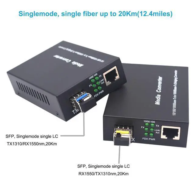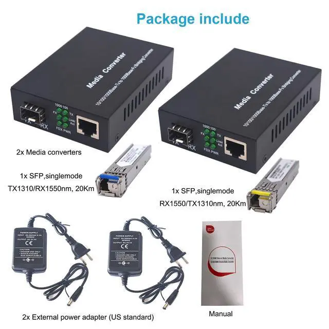 Product content: 2x Gigabit Ethernet Fiber Media Converter. 2x SFP LC Single-Mode module (1310nm/1550nm, up to 20KM). 2x External Power Adapter (US standard),