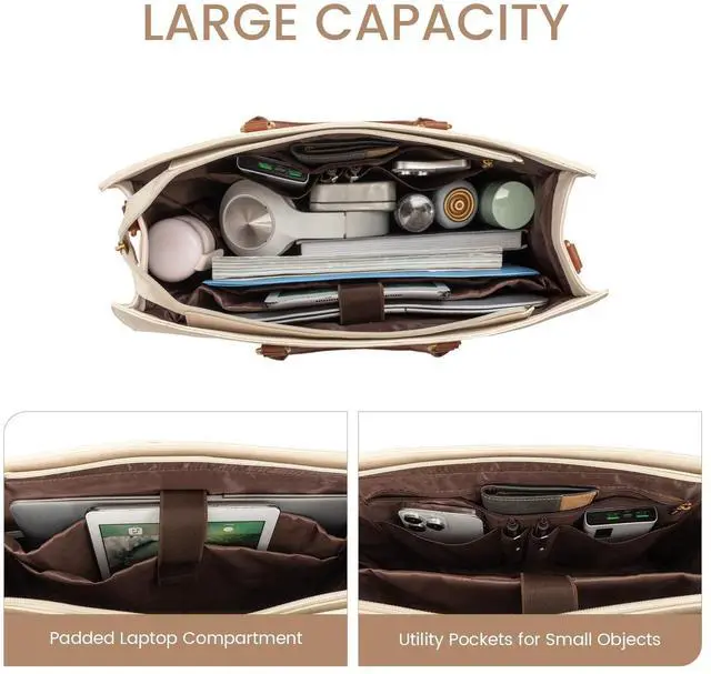 Organized & SpaciousSize: 16.3" x 6"x 12.3". This leather tote bag for women features a separate compartment for a 15.6 -inch laptop and a tablet, 1 large zipper pocket, 2 slip pockets, 2 pen slots, and 1 side pocket, keeping you effortlessly organized all day ^^ Waterproof & DurableCrafted from premium PU leather and high-density nylon lining, this laptop purse is scratch-resistant, waterproof, and easy to clean. Metal feet protect the bottom from wear, while a secure zip-top closure keeps your belongings safe ^^ Easy to UseFeaturing adjustable and detachable shoulder straps from 34 to 52.5 inches, this bag suits women of all heights. Side pockets are perfect for water bottles or umbrellas, making it an ideal work tote, laptop briefcase, or teacher bag ^^ One Bag Fits All Occasions Stylish and sophisticated, this work tote bags for women is perfect for work, business trips, shopping, college, and daily use. It's an ideal choice for Suitable for professional women, students, teachers, and more