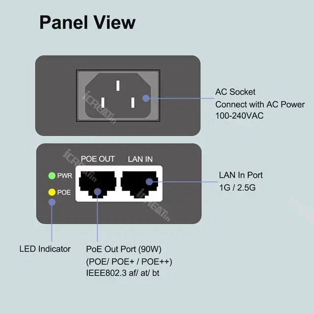 PoE++ / 802.3 btEach PoE++ port powers up to 60W (2 Pair) or 90W (4 Pair) at a very short distance. Power delivered at a longer distance (up to 100m) is 51W (2 Pair) or 71W (4 Pair).