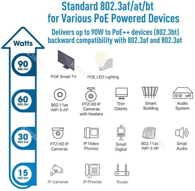 Typical devices are: Conference systems with a large displayUp to 4x4 802.11 ax (WiFi 6) Access PointsPTZ HD IP Cameras with heatersAV over IP encoders/decodersCeiling tiles LED LightingLarge audio speakersPoE+ / 802.3 atEach PoE+ port powers up to 30W (2 Pair) or 60W (4 Pair) at a very short distance. Power delivered at a longer distance (up to 100m) is 25.5W or 51W (4 Pair).