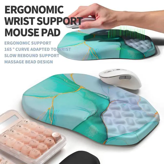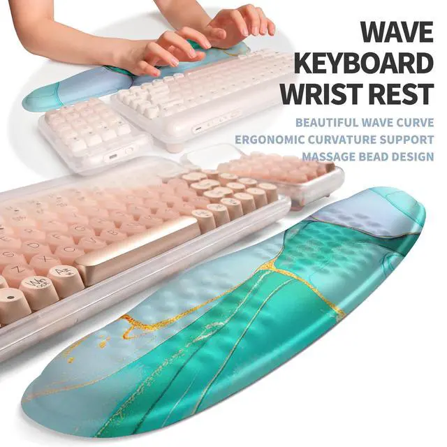 Ergonomic SetWave Keyboard Wrist Rest x1( 17.1 x 3.7 inch, 435x95mm) and Massage Slope Mouse Pad Wrist Support x1( 11.8 x 7.9 inch, 300x200mm), ergonomic curvature design optimization, more in line with the natural position of the shoulder during work, alleviates carpal tunnel syndrome and wrist pain ^^ Wave and SlopThe unique wave curve adjusts the height difference between the wrist and the keyboard. The 165 double-slope mouse pad closely fits the wrist curve support, adjusts the joint and wrist posture, relieves the pressure on the elbows and shoulders during long-term work, and keeps you in the most comfortable state ^^ High Density Smooth FabricHigh density abrasion resistance smooth fabric, easy to slide and improve cursor signal reflection accuracy, accurately capturing sensor displacement distance and precise positioning ^^ Unibody Memory FoamAdopting the pressure integrated molding process, it has the advantages of strong support and slow rebound, soft and comfortable, and will not collapse during long-term use ^^ Micro Stick PU BaseThe base is made of anti slip PU material with slight adhesive properties, firmly attached to the desktop to prevent accidental movement of the mouse pad and ensure that the mouse slides freely