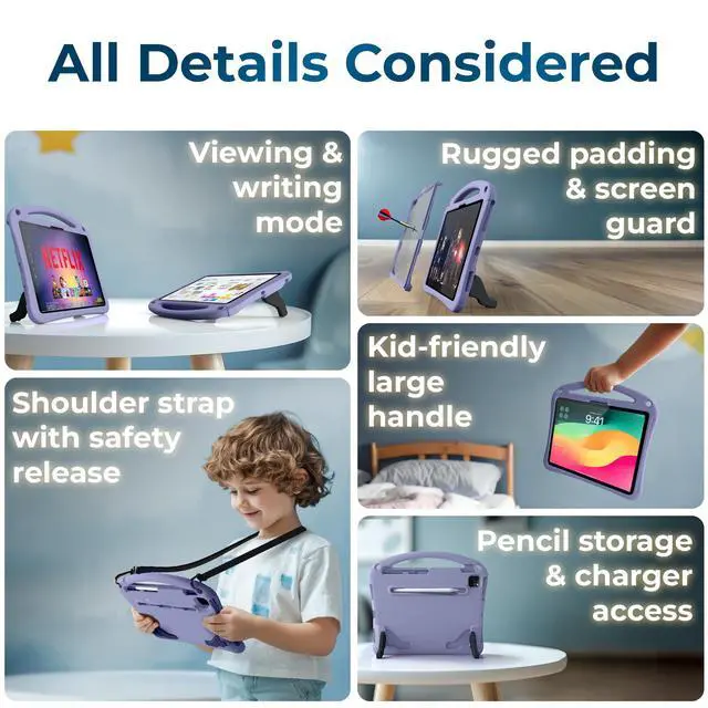 Considered: iPad Air 13 case kids with extra stable dual-angle stand for kids to read, study, watch videos, play games, draw, paint; child-friendly oversized handle; pencil storage; charger access ^^