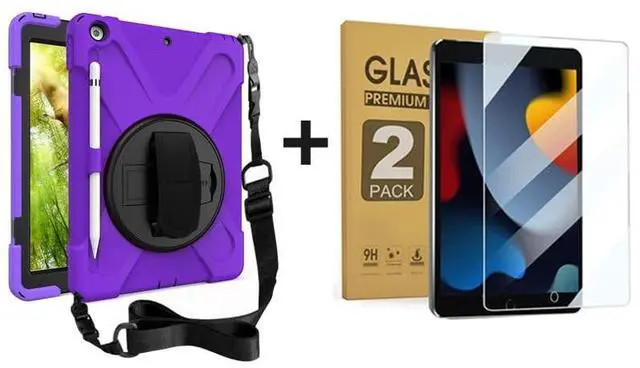 Compatibility: This bundle for 2 Pack anti blue light tempered glass screen protector and rugged case only fits for Apple iPad 10.2 inch 2021/2020/2019 released for iPad 9th generation (A2602 A2603 A2604 A2605); iPad 8th generation(A2270/A2428/A2429/A2430) and iPad 7th generation(A2197/A2198/A2199/A2200) ^^ Adjustable Hand Strap & Portable Shoulder Strap& Rotating Stand: Provide the protection and convenience when you play or work with iPad. Hang it anywhere for your entertainment, makes you using iPad 9th//8th/7th generation case easily. 360 Degrees rotating Kickstand provides convenient viewing, with soft strap, easy to use your 10th gen iPad in your outdoor travelling, working, gaming with kids.
