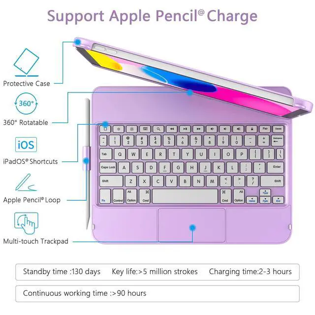 At Your Fingertips: Laptop-like keyboard for ipad 10th generation case, accurately type on an keyboard with a full row of PadOS shortcuts and comfortable keys. Full row of hotkeys lets you Search, Lock the Screen, Control Audio, or Go Back to the Home Screen from the keyboard. Making it more comfortable to use, Hotkeys &Trackpad gestures expand the way you work with iPadOS ^^ 360 Rotatable & 180 Flip for iPad 10th