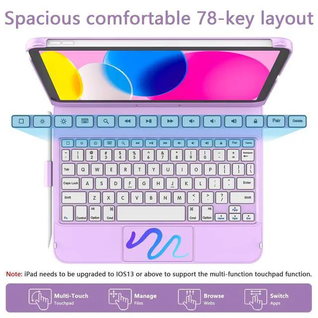 Generation 2022: For iPad 10th generation keyboard case with integrated multi-touch trackpad, with plentiful trackpad gestures, you can turn it into a highly performant and easy to use laptop! Like swipe and scroll to navigate even faster, that opens up new ways to work with ipad. Delivering a comfortable user experience while allowing you to click and swipe through content effortlessly ^^ Excelent Features of iPad 10th Trackpad