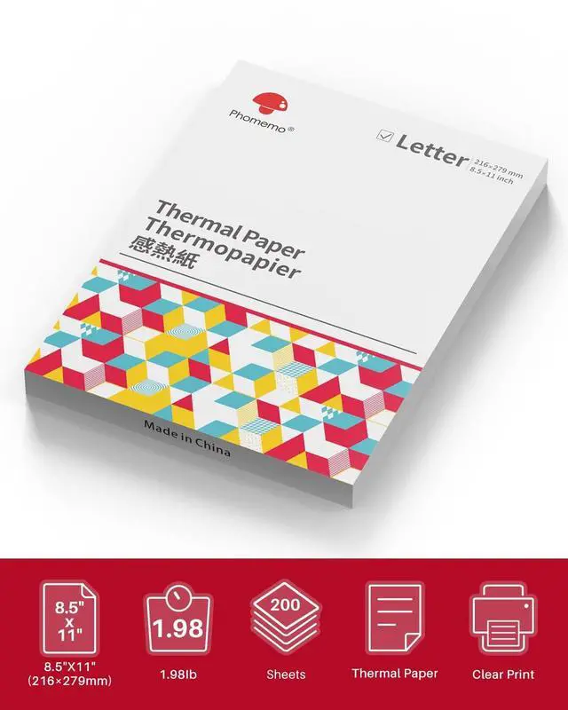 Specifications - 8.5"x11" sized sheets US Letter thermal paper. Quantity: 200 Papers Per Pack. Our thermal paper has a thickness of 0.077-0.078mm in a single sheet.