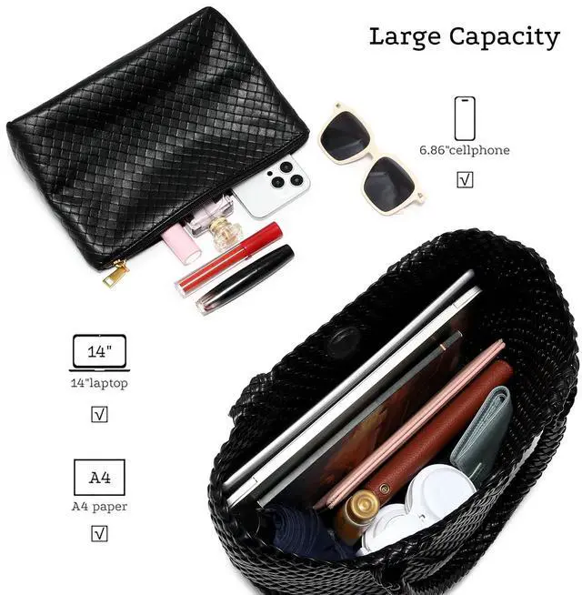 HIGH CAPACITY AND PRIVACY: This Woven Tote Bag have a Large 13 x 12.2 x 6.7 inch capacity perfect for daily essentials, including 14-inch laptop, A4 papers, cosmetics, books, and a light coat. it can be used as a laptop bag, It also includes a wallet for organizing cards, keys, and phones. ^^