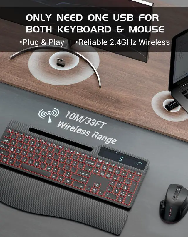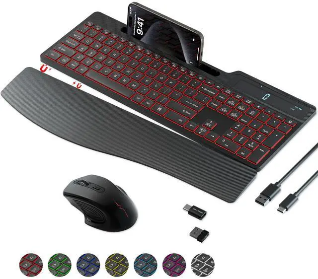 Elevate your workspace with our vibrant backlighting options and effortlessly work in the dark with enhanced visibility and style. ^^ [ Phone Holder & Calculator ] Our full-size wireless keyboard features a convenient phone and tablet holder, as well as a built-in calculator with a digital display function. This versatile design allows you to multitask efficiently, ensuring you never miss important messages or notifications while working on your laptop. Elevate your workspace with added convenience for seamless multitasking. ^^ [ Ultimate Ergonomic Comfort ] Experience unparalleled comfort with our wireless keyboard mouse combo featuring an ergonomic design with a magnetic wrist rest and folding stand which are meticulously crafted to provide a comfortable touch and typing feel, reducing pressure on your hands and wrists.