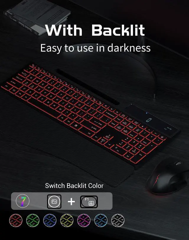 [ Office Keyboard Mouse Set ] Use 2.4GH z Wireless Keyboard and Mouse Combo to enjoy comfortable and efficient typing experience, featuring 112 vintage black square keys and 16 shortcut keys for a smooth and responsive press and click. ^^ [ 7 Colored Vibrant Backlighting ] Our wireless keyboard mouse combo offers a total of 7 backlit effects, With 3 brightness levels, you can create a personalized visual typing atmosphere that suits your style. The illuminated keycaps and letters not only make typing easier in low light conditions but also enhance the clarity of the keys under the backlight.