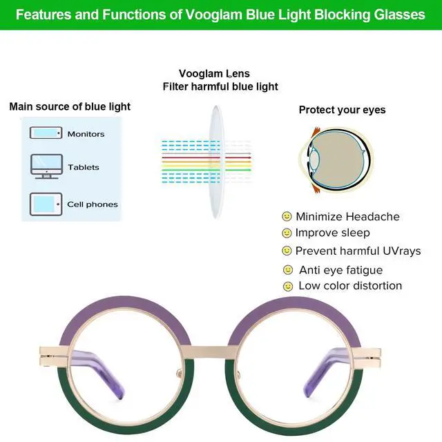 instruction: Why do we need to filter blue light? Blue light from our computers, phones, tablets, and other electronic products causes our eyes to not only work harder but puts them at risk of aging faster. By wearing blue light blocking glasses, you can limit the amount of blue light that enters your eyes and make your screentime more pleasant. Reduce eye strain, eye fatigue, and sensitivity to light during computer term or any other digital time. Protect Your Eyes from macular degeneration and early vision loss, more concentrate on working and learning. Vooglam glasses are specially designed to filter out harmful blue light. Reduce the symptoms of digital eyestrain, Eyestrain, headaches, sore or tired eyes, and stiff necks are all symptoms of digital eyestrain. Vooglam blue light blocking glasses make screen time more comfortable and help eliminate symptoms of digital eyestrain.
