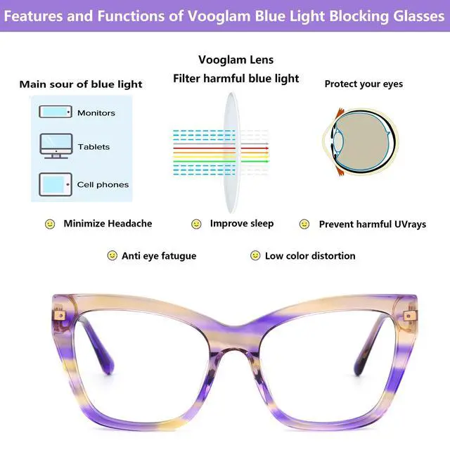 Range: 2.13 "" ~ 3.07"" /(54~78 mm)Product instruction: (1) Why do we need to filter blue light? Blue light from our computers, phones, tablets, and other electronic products causes our eyes to not only work harder but puts them at risk of aging faster. By wearing blue light blocking glasses, you can limit the amount of blue light that enters your eyes and make your screen time more pleasant. Reduce eye strain, eye fatigue, and sensitivity to light during computer terms or any other digital time. Protect Your Eyes from macular degeneration and early vision loss, more concentrate on working and learning. Vooglam glasses are specially designed to filter out harmful blue light. Reduce the symptoms of digital eyestrainEyestrain, Headaches, sore or tired eyes, and stiff necks are all symptoms of digital eyestrain. Voogueme blue light blocking glasses make screen time more comfortable and help eliminate symptoms of digital eyestrain.