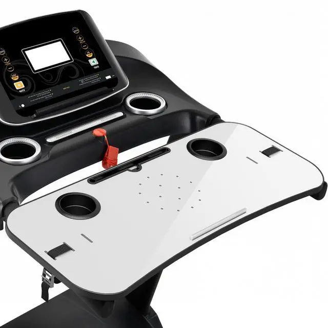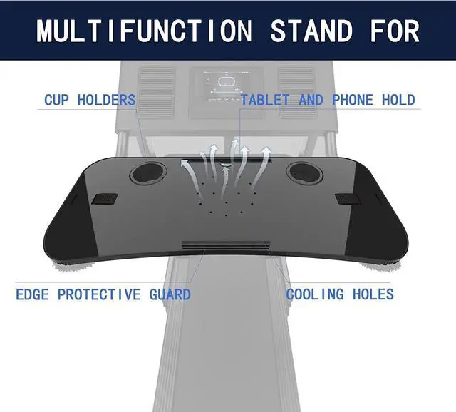 Universal Treadmill Desk! Ample space for your laptop, tablet or drinks. With the size of 25.2IN * 34.65IN /64CM * 88CM, create your very own active workstation! This treadmill laptop tray ergonomic platform is with 2 cup holders, a tablet phone holder and a edge protector. It holds your equipment safe and secure while you walk and get your work done. ^^ Upgraded Treadmill Desk! This treadmill laptop holder would be a total enhancement to your work out experience, get your work done and burning off the calories at the same time! It's universal treadmill tray for laptop, fits treadmill handrails distances from 25" to 32".