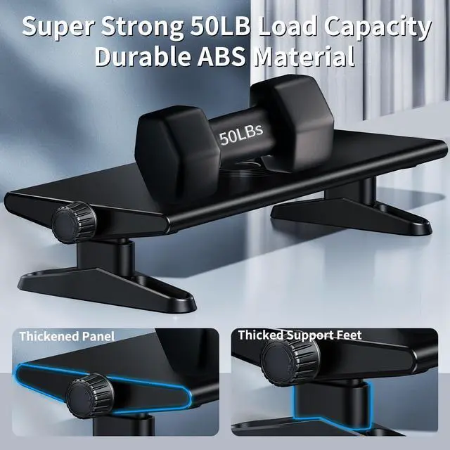 4.5 - 6.3 Inches Freely Adjustable & Knob Lift Unlike other monitor stands that can only be adjusted at a fixed height, our monitor stand allows you to adjust between 4.4 - 5.7 inches freely. Our knob lift design allows you to adjust it with one hand, and you don't need to move the monitor, which is more trouble-free and more convenient than other monitor risers. ^^ Strong Bearing Capacity & Widely Applicable Our desktop riser adopts upgraded materials and designs. The thick ABS hard plastic material allows the gaming monitor stand to bear 50 pounds easily.