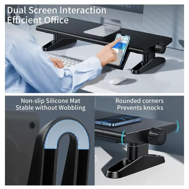The compact and solid design and production make it very stable and does not shake at all. Not only suitable for monitors and laptops but also for speakers, printers, coffee machines, TV, etc... ^^ Comes with a hidden mobile phone holder for better work We thoughtfully designed a hidden mobile phone holder on the computer screen stand, so that you can use your computer and mobile phone for work and entertainment at the same time, saving you the trouble of rummaging for your mobile phone. You can easily retract the phone holder when not using it, keeping the computer stand for desktop monitor tidy.