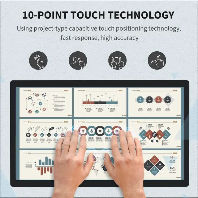 • True Flat Seamless Design: iP65 standard touch screen monitor, smooth back-shell and lightweight aluminum alloy frame, special design for day to day high traffic work environment, support wall mount, 100x100 VESA holes and desktop stands