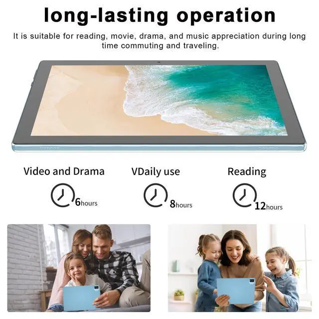 ^^ 6000mAh Battery This Android tablet powered by a 6000mAh battery, durable battery life ensures long-term use, allowing you to study, work, and play all day without interruption. Accompanying you from day to night can bring about 6 hours of regular operation, with a battery life standby of up to 12 hours, can easily charge via the 5V2A Type-C port. ^^ 2+8MP Dual Camera Our 10 inch tablet equipped with a 8MP rear camera with auto focus and flash, shooting is equally clear during the day and night. The 2PM front camera bring excellent clarity during video calls.