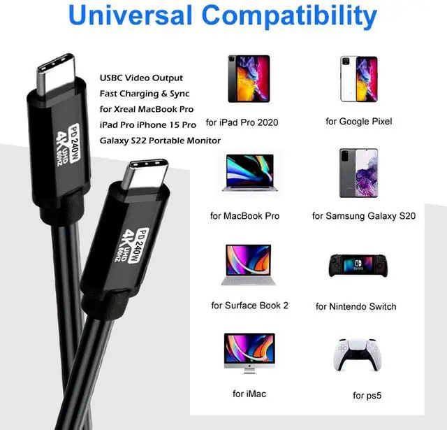 Data Sync: Power your devices with 240W charging capacity, ensuring compatibility with a wide range of devices with our USB C male-to-male cables, backwards compatible with various power delivery standards, including 100W, 96W, 87W, 61W, 60W, 30W, 18W, and 15W, as well as PD 3.1, 3.0 / 2.0, QC 4.0, 3.0 / 2.0. With 20Gbps data transfer capability, the cable enables fast file transfers and seamless performance for high-speed connectivity. One for AllThe 240W USB C to USB C cable can charge all your C-port devices and replace all your USB C cables. Backward compatible with lower power requirements like 180W/140W/100W/60W and below.