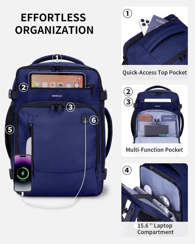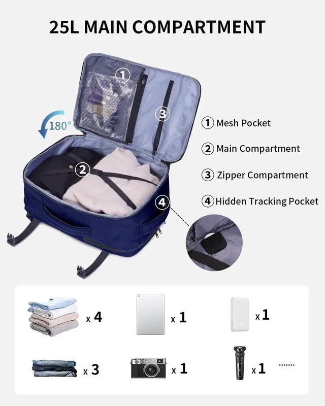 • DESIGNED FOR TRAVEL: This carry on backpack features a 180 opening for easy packing. The main compartment includes two pockets to keep toiletries and socks organized, with elastic straps to secure your essentials. A dedicated AirTag pocket helps you track your bag easily. Side compression straps compact the bag, while the side handle and trolley sleeve provide multiple carrying options for added convenience.