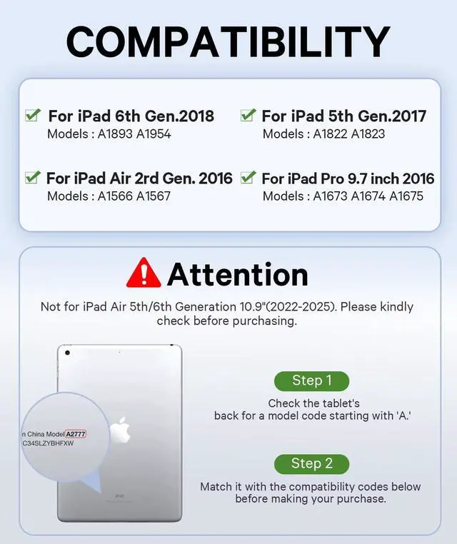 Compatibility: GreenLaw Keyboard for iPad 9.7 is compatible with 2018 iPad 6th generation (A1893/A1954), 2017 iPad 5th generation (A1822/A1823), iPad Pro 9.7 (A1673/A1674/A1675), iPad Air 2 (A1566/A1567). Before you order, please check the back of your iPad to confirm the model number.