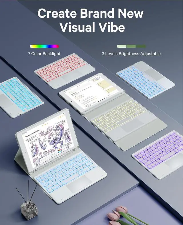 Color Backlit: Easily switch between 7 gorgeous colors and 3 brightness with a simple touch. You can adjust the keyboard to your favorite color according to your preferences, and easily make your iPad 6th generation case with keyboard more stylish. It is also convenient for keyboard operation under dim light, and it can also bring you a different visual enjoyment and comfortable typing experience with your iPad.