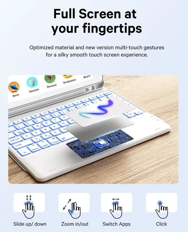 ^^ Multi-Touch Trackpad: Equipped with a smart touchpad that can accurately control and navigate, realize the combination of tablet and computer functions, and enjoy an excellent notebook experience. Control your iPad 5th Gen. at multi-gesture. Edit documents, browse the web, and build presentations with unparalleled speed, bringing you the convenience of high productivity. Navigating even the most complex workflows has never been easier.