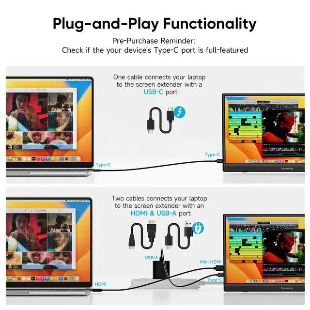 ^^ Plug and Play Right Out of the BoxNo complicated setup needed! This portable laptop monitor instantly connects as a second screenplug it in and start using it. It works with most modern laptops via USB-C, so youll be ready to go in seconds.