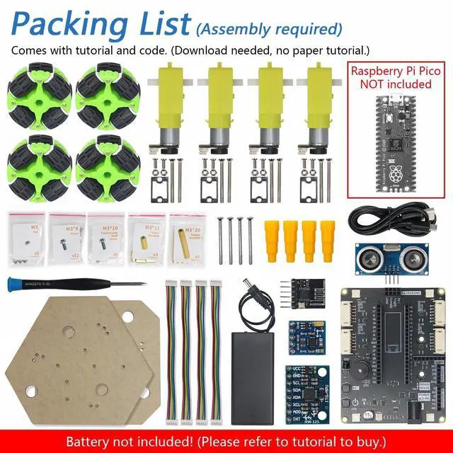 )Needed but Not Included: 1 x Raspberry Pi Pico board (Any models) 2 x Battery (Please refer to the downloaded tutorial to buy. )1 x Charger for battery