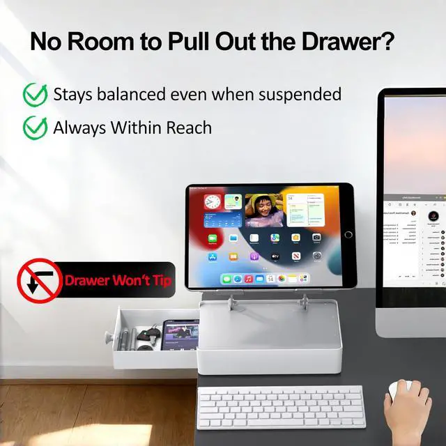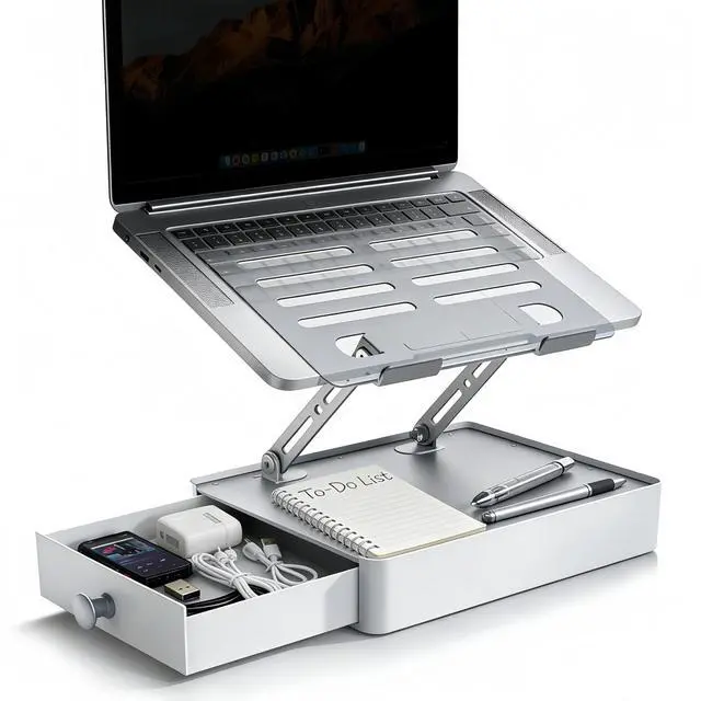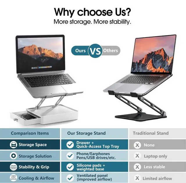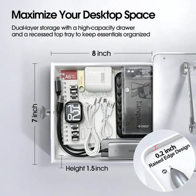 BUILT-IN STORAGE DRAWER: This laptop stand with storage features a spacious built-in drawer to keep your desk organized and clutter-free. Store external drives, USB hubs, cables, power adapters, notebooks, e-readers, AirPods, smartphones, and more. The subtly raised top surface above the drawer also provides a convenient spot for small items like sticky notes or pens, keeping essentials visible and within easy reach. The built-in drawer stop and anti-tip structural design ensure the drawer stays securely in placeeven when pulled out over the edge of the desk ^^
