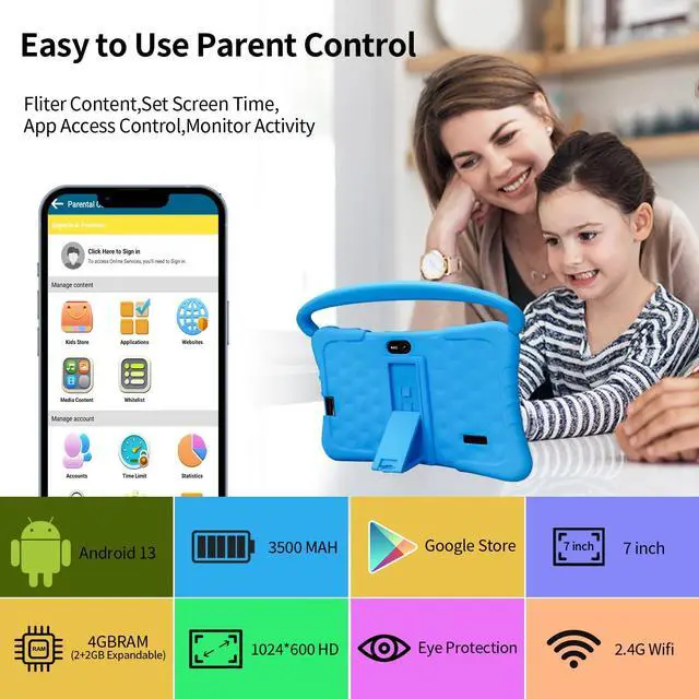 • Pre-installed Parental ControlUtilizing the pre-installed iwawa app or family link, parents can set time limits,effectively managing your child's screen time and avoiding excessive use. The app also provides insights into your child's activities,helping you monitor their app usage and ensuring they engage in productive and educational content,including educational games, kid's learning materials,art and craft activities,and captivating video shows.