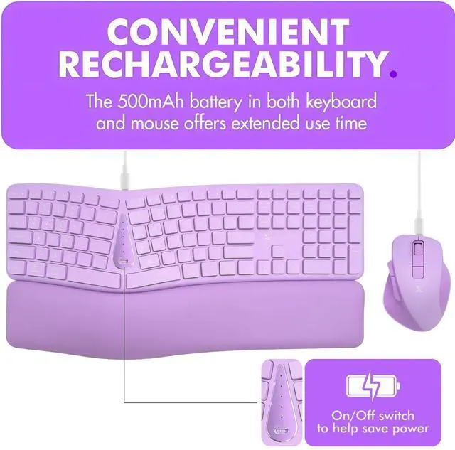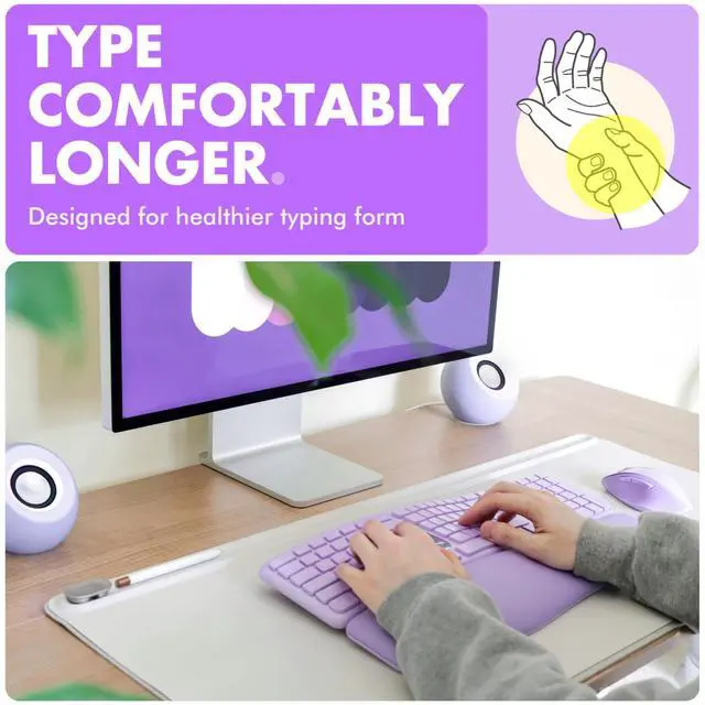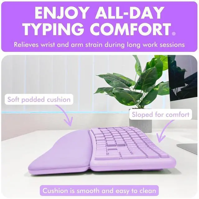 All-Day Comfort: The split keyboard, soft pillow wrist rest, and contoured mouse help reduce strain and improve comfort during long work sessions.