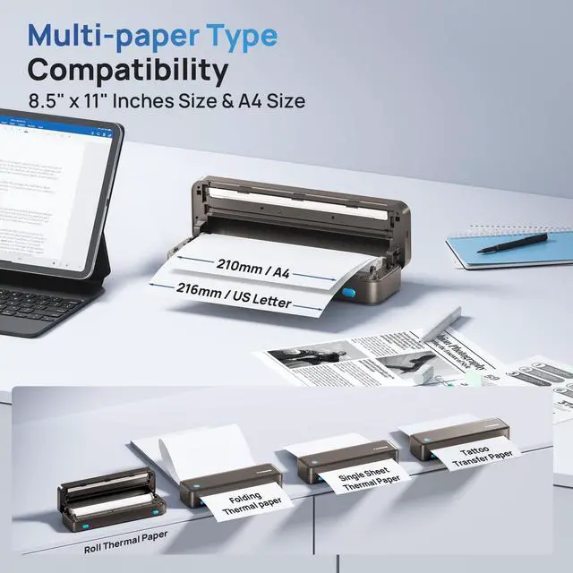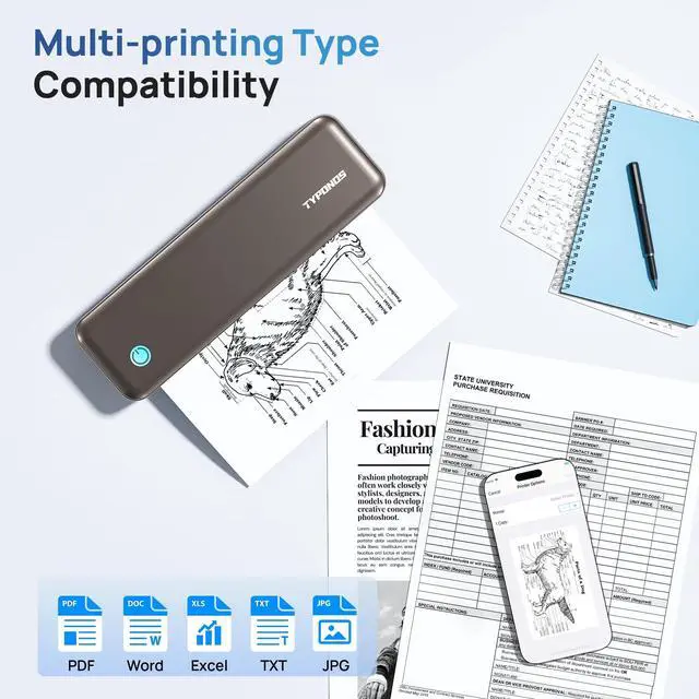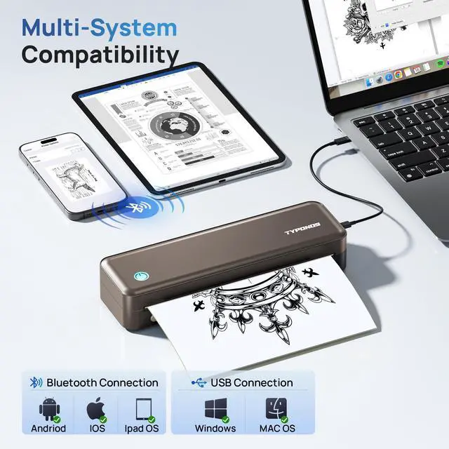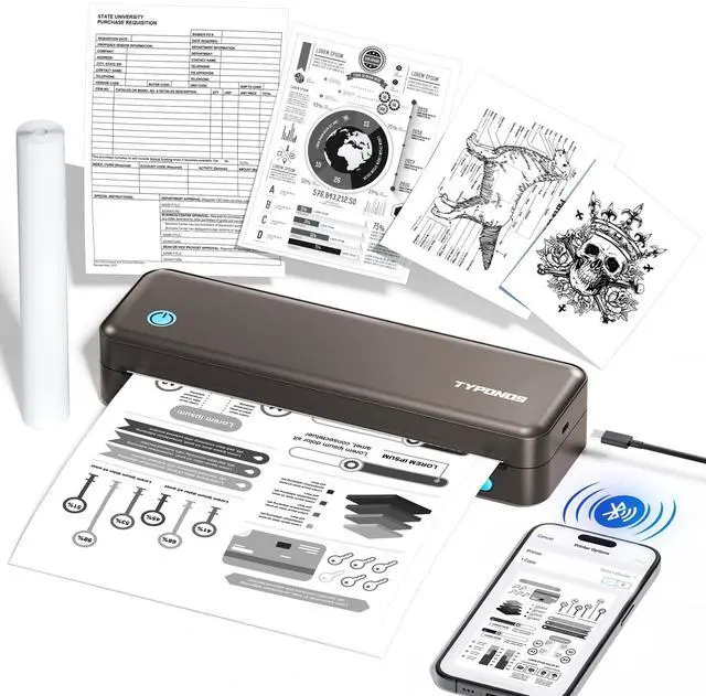 This is a portable printer, (impresora portatil). It has both inkless printer & wireless printer technology, and prints on thermal printer paper or tattoo printer paper. It is used as a tattoo stencil printer in addition to printing documents. This small printer is an ideal portable printers wireless for travel, also suitable for home, office, vehicle and outdoor use.
