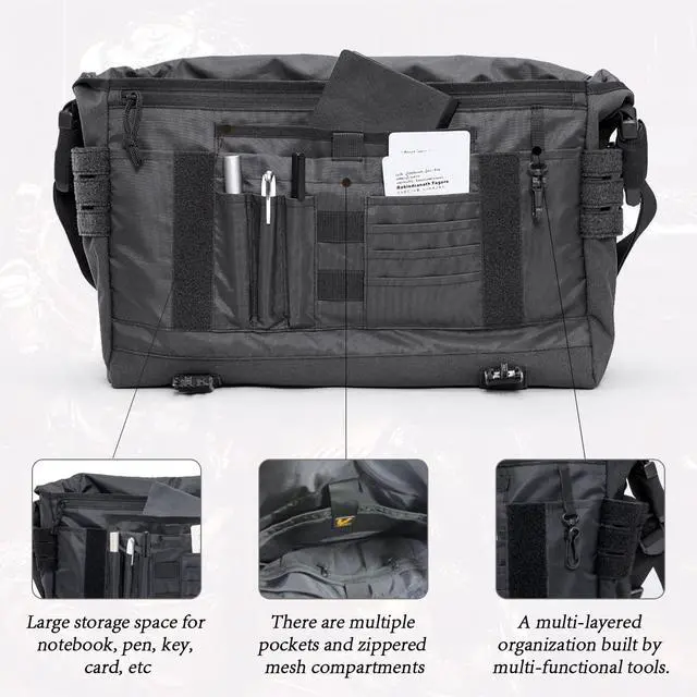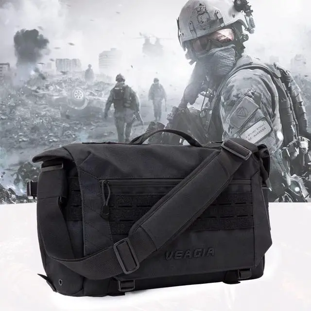 DescriptionVEAGIA BrandSize: 17X12X5 inch17 inch military laptop bag messenger bagFeatures: 1) VEAGIA messenger bag is imported from the latest high density 1050D Waterproof nylon, more wear-resistant, waterproof inner layer is protected with 400D Unigel effect. Firmness, abrasion resistance, zipper and Velcro design add long-lasting performance. 2) The main compartment has a bumper foam pad that can hold up to a 17-inch laptop or iPad to prevent accidental bumps. Load multiple bags in the front, but hide/protect them under the inconspicuous flap. 3) messenger bag men, two side pockets are designed to store water bottles and umbrellas. 4) men messenger bag, can