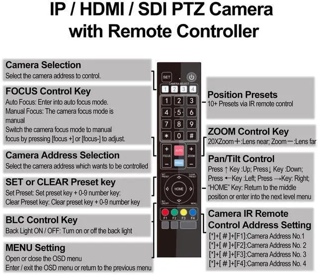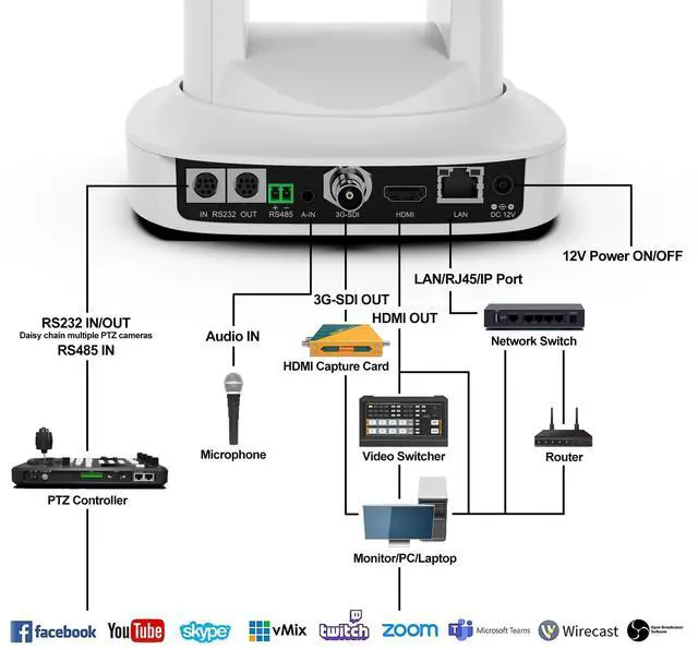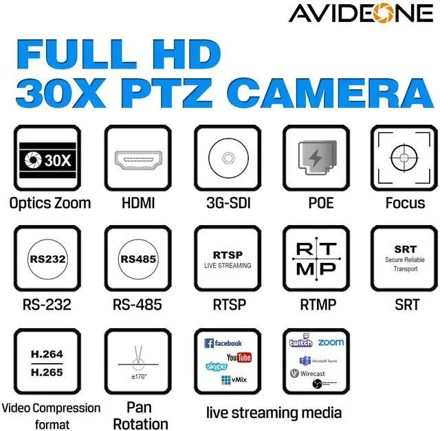 30X Optical Zoom for PrecisionThe PTZ 30X optics camera options provide exceptional flexibility for capturing distant subjects. ^^ Multiple Video OutputsHDMI, 3G-SDI, and LAN interfaces provide flexible connectivity, with 3G-SDI supporting 1080p60. ^^ Advanced Noise Reduction2D/3D noise reduction technology ensures high SNR and sharp, clean video in any lighting condition. ^^ Wide CompatibilityThis PTZ conference camera supports multiple control protocols, making it ideal for video conferencing, live streaming. ^^ 30X Optical Zoom PoE Support The camera and controller both support POE, with one ethernet cable to power on the camera ^^ PTZ Camera with 30x Optical Zoom (White) x1Camera Wall Mount Bracket (White) x1Camera Ceiling Moun Bracket (White) x1; Remote Controllerx1RS-232 Interface Cablex1Power Adapter x1