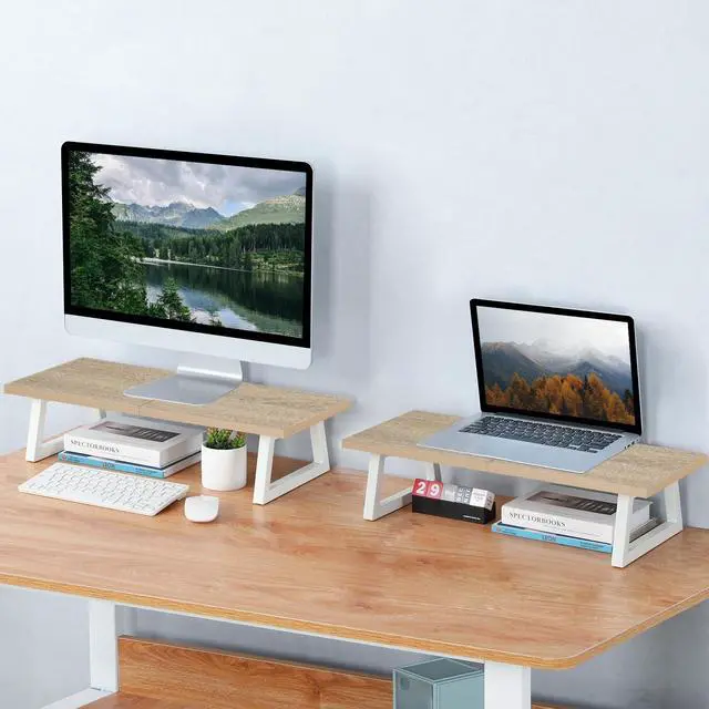 Multifunctional StandTEAMIX stand can be monitor/laptop/printer stand riser Tv box /game ^^ Spacious Wood SurfaceThe wood top surface area is large and wide enough to hold your monitor/ laptop & docking station, it is smooth, comfortable, and trendy. ^^ Storage Space UnderneathThe Stand made of thickened steel frame can hold 150Ibs, strong and sturdy. It can storage your keyboard, cords, pens, office supplies, etc, and makes cable management pretty easy. Ergonomic design, relieves eyesight and back fatigue during work. ^^ Size & Easy Assemble 23.6 * 9.5 * 5.7 inch (L*W*H)