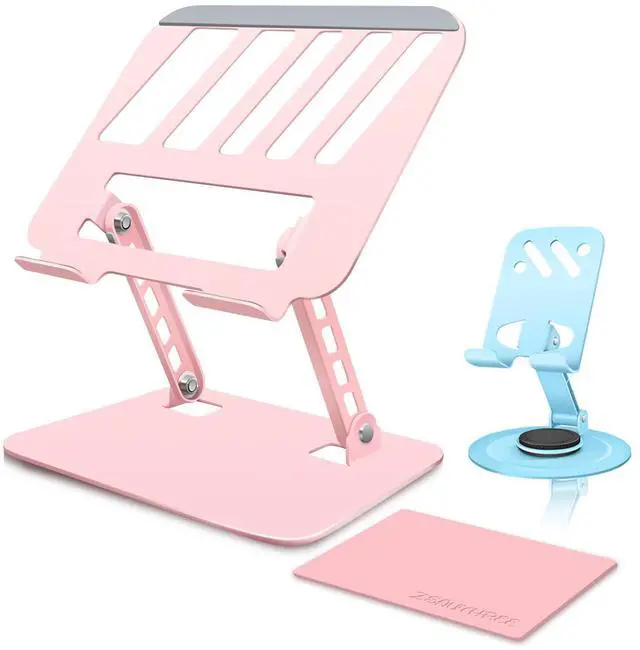 Mobile Lifestyles: Metal pink laptop stand with a sleek, Lovely girly color series, foldable design, this travel laptop stand is a traveler's essential. It folds compactly, easily fits into a backpack, and takes up little space. Perfect for on-the-go business pros, enabling a comfy, efficient workstation anywhere, from airport lounges to hotel rooms. ^^ Broad Compatibility for