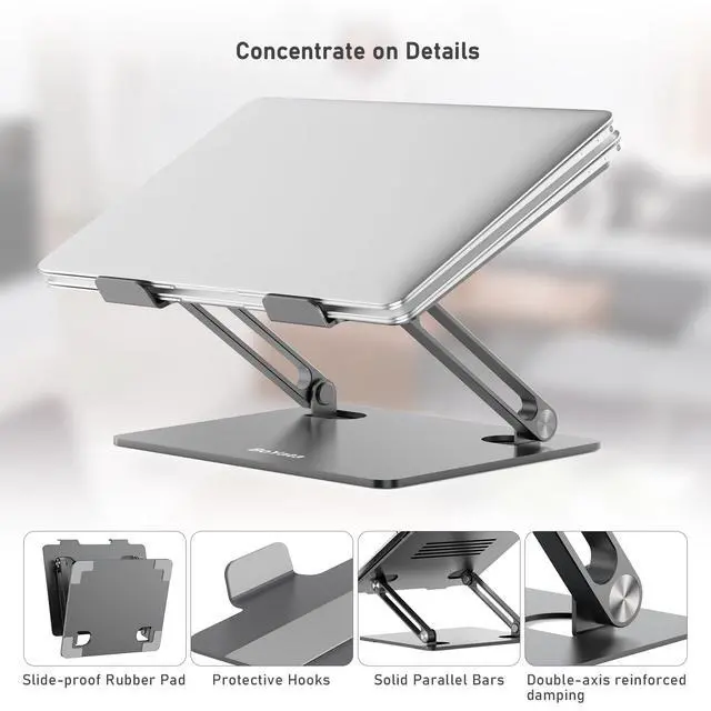 ^^ STEADINESS: With a large support area and 1.8 cm alloy steel parallel bars are sturdy enough to support a large-sized laptop, and can withstand up to 10kg. 4 slide-proof silicone pads and protective hooks prevent your computer from sliding.