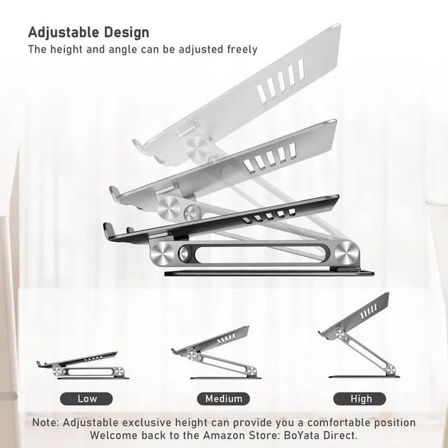 ^^ ADJUSTMENT: The laptop stand for the desk is made of sturdy alloy steel, you can incline at different angles and stand it up higher or lower depending on your needs, It keeps your computer up high so you have more space on the desk papers and other stuff.
