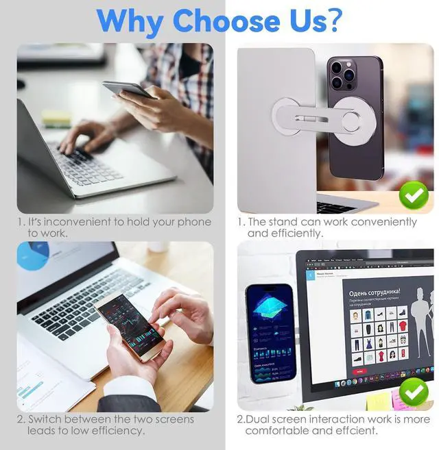 • New Upgraded Laptop Phone HolderMagnetic laptop phone holder is designed for iPhone 15 / 14 / 13 / 12 series, magnetic case and other phones or cases with metal ring (Work with all phones). Suitable for laptops, desktop monitors or various tablet monitors, easily view text messages or video conferences while working, enjoy dual screens and improve office efficiency.