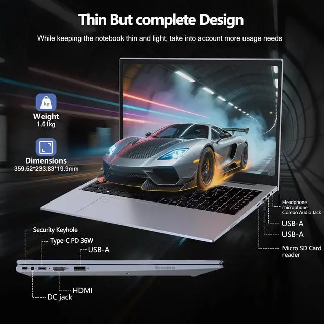 Extensive & Premium Connectivity: This laptop is equipped with a variety of ports. 3 USB ports for fast data transfers between multiple peripherals, a DC port to keep the power on, a headphone jack for private, a Micro SD card slot for easy storage expansion, an HDMI port for connecting to an external display, and a Type-C port for modern and flexible connectivity. It allows you to effortlessly connect a variety of devices for increased productivity and is for handling any work or play scenario ^^ Portable