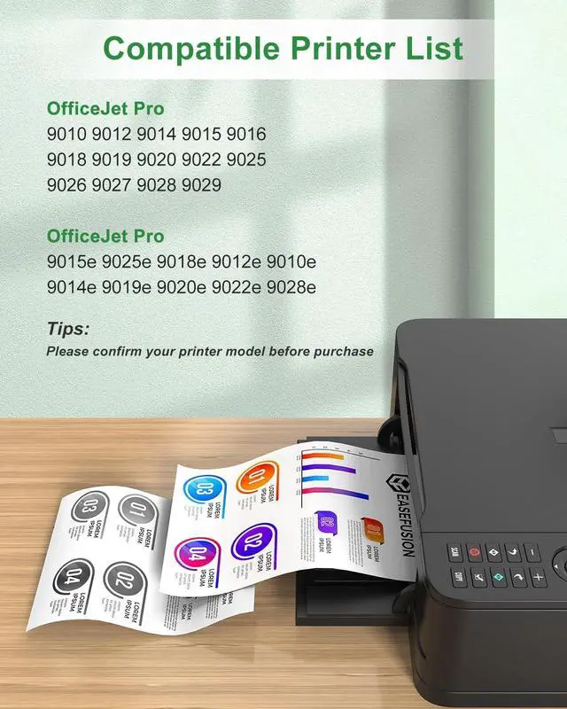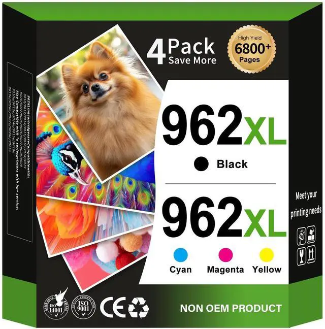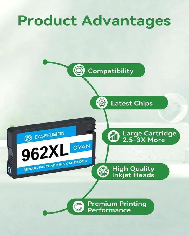 Advanced Chip Technology: EASEFUSION 962XL ink cartridges engineered with state-of-the-art smart chip technology, these 962 ink cartridges are optimized for seamless performance in HP+ printers. They also support for HP OfficeJet Pro e-series models (Such as OfficeJet Pro 9010e 9012e 9014e 9015e 9018e 9019e 9020e 9022e 9025e 9028e Printer) ^^ For HP 962XL Ink Cartridges Combo Pack High Page Yield: Deliver exceptional value with yields of up to 2, 000 pages for HP 962XL black and 1, 600 pages for HP ink 962XL color combo pack, based on standard 5% page coverageideal for high-volume printing needs ^^ For HP 962XL Ink Cartridges Combo Pack Printer CompatibilityDesigned to work flawlessly with a wide range of for HP OfficeJet Pro printers, including the 9010/9014/9015/9012/9016/9019/9018 and 9020/9022/9026/9025/9027/9028/9029 series ^^ Compatible *E