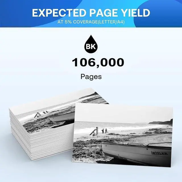Page yield: 106, 000 Pages per black cartridge at 5% coverage of Letter/A4 ^^ Remanufactured toner cartridges use chips made in the U. S. and toner made in Japan to ensure the same print results as the original ^^