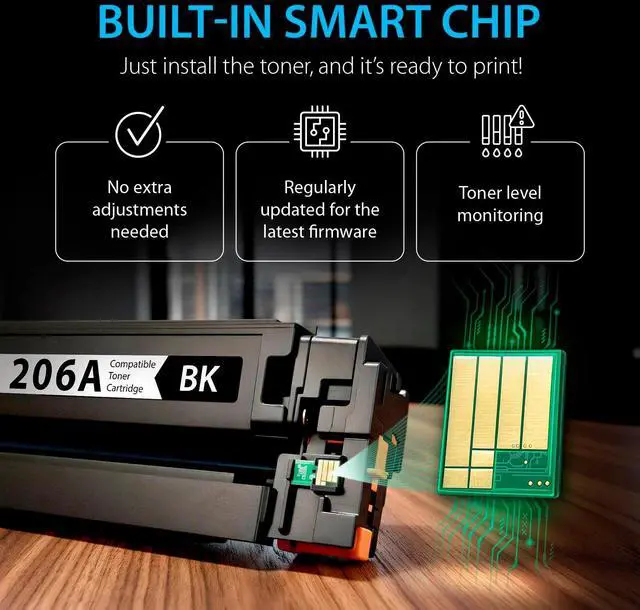 Built-in Smart Chip: Each Smart Ink replacement for HP 206A black toner cartridge and color cartridge has a New Built-in Chip, so there is no need to remove the old chips and install it on the new toner cartridge - easy to use, just install and print ^^ Print More with High Yield 206A