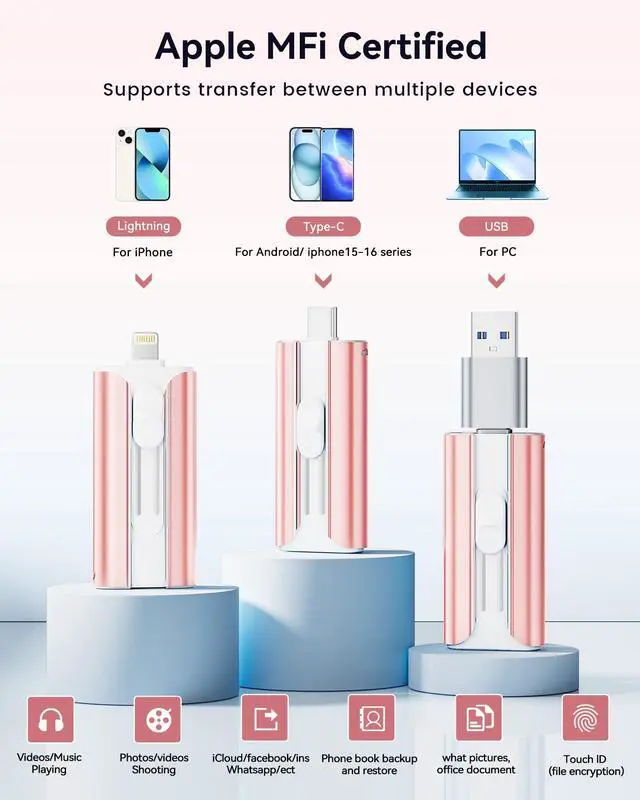 USB Stick Device: The usb drive is equipped with three interfaces, including Lightning, Type-C, and USB, allowing easy data transfer between multiple devices. No extra cables, iTunes, or iCloud are needed, so you can seamlessly switch between your phone, tablet, and computer. Free up space on your iPhone and quickly transfer files to and from your computer, making storage and sharing more efficient. Never worry about running out of storage again ^^ One-Click Backup, Enjoy